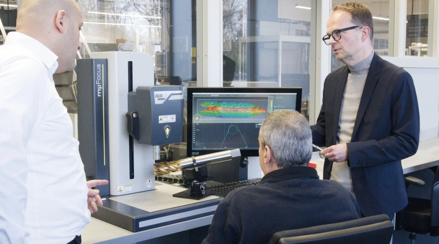 In der Folge verfügen sie über eine zertifizierte Qualitätssicherung mit Dokumentation der Schneidkantenparameter. Sie arbeiten dabei mit einem Inspektionsgerät »mμFocus« von ZOLLER. „Nach ausführlichen Vergleichen der aktuell verfügbaren Messverfahren und Messgeräte waren wir überzeugt, dass das »mμFocus« von ZOLLER unseren reproduzierbaren Forderungen entspricht“, erläutert Volker Nötzel. Es ist kompakt und robust. Somit eignet es sich zum Messen sowohl Fertigungs-begleitend als auch im Rahmen der Endkontrolle. Es arbeitet berührungslos optisch mit Laserlicht und einem Messmikroskop. Der Messfleck misst nur 10 x 10 mm. Auch kleinste Konturen und Geometrien kann man kleiner 1 μm genau erfassen. Zudem bewältigt das Inspektionsgerät »mμFocus« problemlos komplexe Geometrien, wie Schneidkanten und Gewindeflanken auf Schneidsegmenten an hochgedrallten Gewindebohrern.