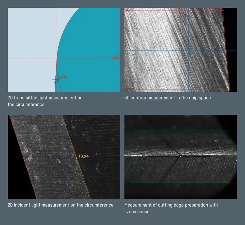 Cámara de luz incidente con iluminación de segmentos Multi-LED y Dispositivo de giro CNC: para la inspección y medición automática de geometrías de herramientas en el perímetro, en el área de virutas y en el frente. Basta con introducir los parámetros deseados en el Diálogo del programa de medición y cada variable se mide y registra automáticamente: ángulo de desprendimiento|ángulo de arranque, ángulo de incidencia, Contorno de ranura, anchura de bisel y muchas otras geometrías. Los LED de alto rendimiento, segmentados en ocho áreas, son controlados de forma automática por el sistema de medición y garantizan una iluminación de forma óptima de la superficie gracias al Control de intensidad, lo que proporciona una alta precisión y precisión de repetición. El equipamiento|equipo de los sensores es configurable.
