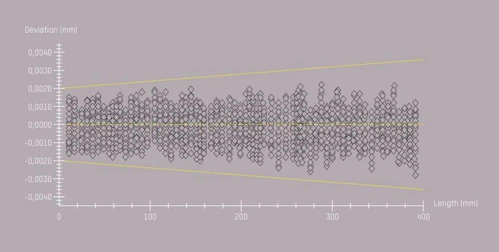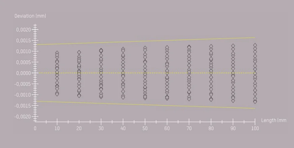 Las exigencias en materia de gestión de calidad aumentan constantemente. Por eso, debe poder confiar en las desviaciones de medición constantes de sus máquinas. En las máquinas de medición ZOLLER, las desviaciones de medición de longitud se determinan con estándares de calibración de alta precisión fabricados en vidrio Borofloat® según la norma DIN EN ISO 10360. De acuerdo con esta norma, se realizan al menos tres secuencias de medición (25 326 relaciones). Con este procedimiento se documenta de forma bidimensional la precisión de las máquinas de medición ZOLLER y se puede verificar en cualquier momento.
