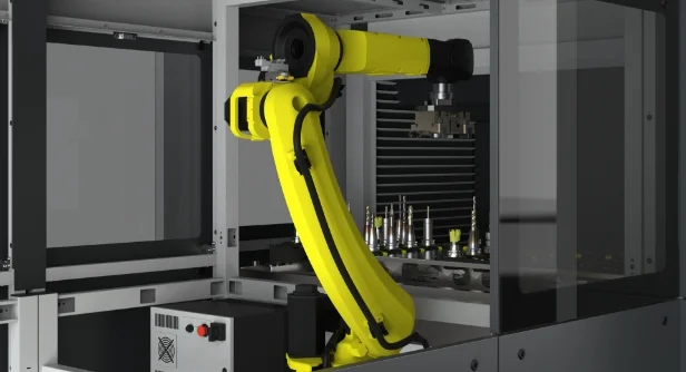 Roboterbasismodul – bei dem der FANUC 6-Achs- Knickarmroboter die Werkzeuge greift und zuverlässig zwischen dem Ein-/Ausgabemodul und dem Liftsystem transportiert.
