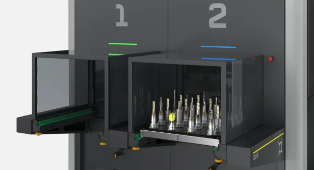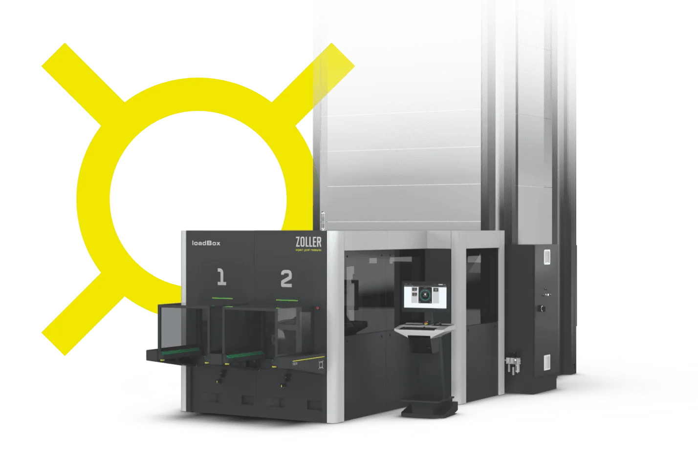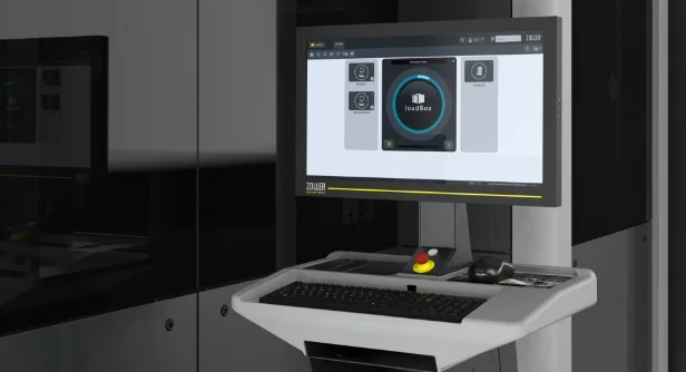Liftsystem Kardex Shuttle – stellt die Werkzeuge aus dem Werkzeuglager zur Verfügung. Über Tablare, die mit ZOLLER-Traggestellen belegt sind, werden die Werkzeuge aus dem Liftsystem ausgelagert und mit der Automatisierungsanlage »loadBox« kommissioniert.
