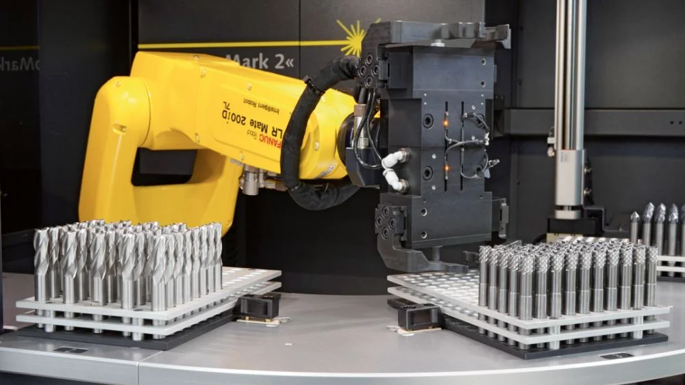 Mit dem ZOLLER-Lasermarkiersystem »roboMark« werden Werkzeuge, welche in der Toleranz liegend vermessen wurden, wahlweise am Schaftumfang oder -ende beschriftet. Die Beschriftung selbst ist individuell und bietet viele verschiedene Einstellmöglichkeiten. Auch QR- oder DataMatrix-Codes lassen sich ohne Mehraufwand aufbringen und ermöglichen über die Kopplung zur Werkzeugdatenbank eine Rückverfolgbarkeit des jeweiligen Werkzeugs.