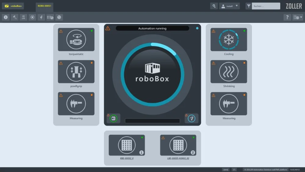 Die grafische Bedienoberfläche der » roboBox« bietet eine klare Übersicht über alle verfügbaren Einzelmodule, einschließlich Funktionen wie Messen, Schrumpfen und Kühlen. Darüber hinaus werden Statusanzeigen für jedes Modul eingeblendet, die den aktuellen Zustand und den Fortschritt der laufenden Prozesse des Roboters anzeigen. Diese Statusanzeigen ermöglichen es Benutzern, den Betrieb des Roboters effektiv zu überwachen und potenzielle Probleme rechtzeitig zu erkennen.