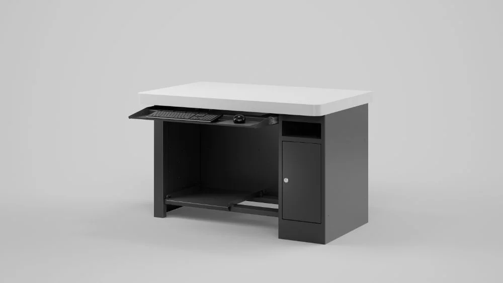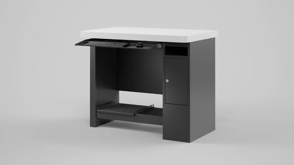 Formstabile und sichere Positionierung des Inspektionsgeräts »pomBasic« und »pomBasicMicro« als Steharbeitsplatz. Inklusive ausziehbarer Ablage für Maus und Tastatur.