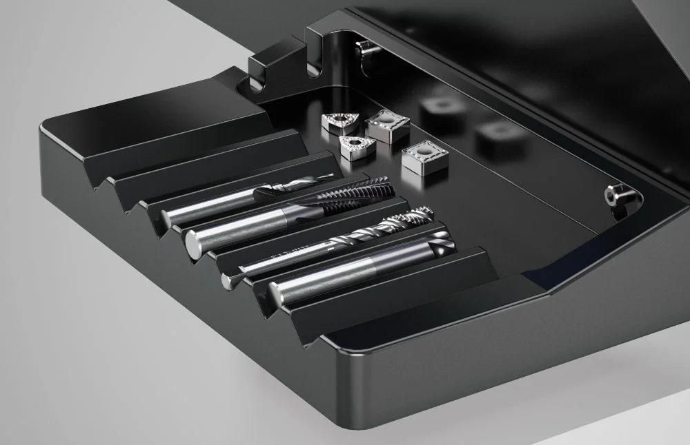 Die an der linken Seite des Inspektionsgeräts angebrachte Ablage erlaubt die schonende Aufbewahrung von Werkzeugen mit einem Schaft von maximal D 50 mm. Zudem bietet die Ablage ausreichend Platz für Kleinteile und Wendeschneidplatten.