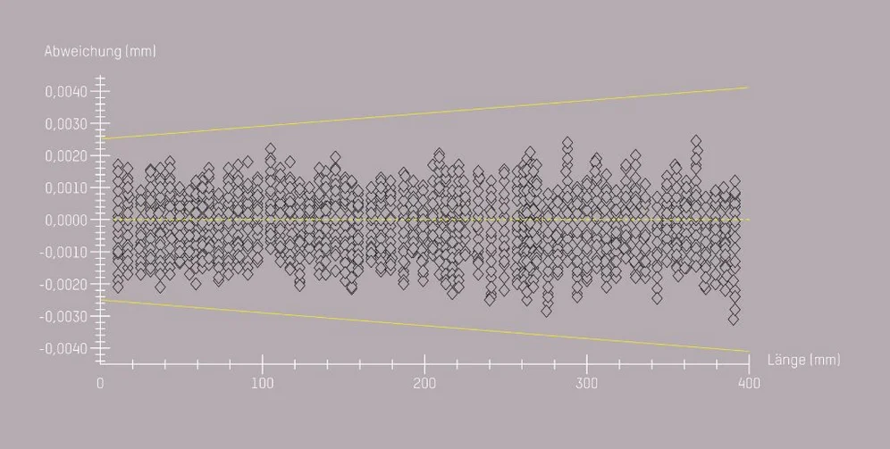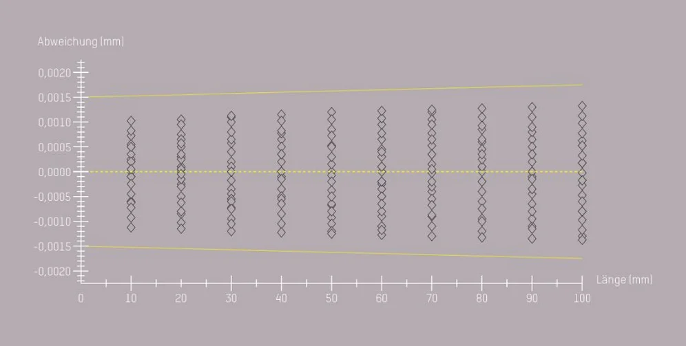Die Ansprüche im Qualitätsmanagement steigen ständig. Deshalb müssen Sie sich auf die konstanten Messabweichungen Ihrer Maschinen verlassen können. In ZOLLER-Messmaschinen werden mit hochpräzisen Kalibriernormalen aus Borofloatglas® die Längenmessabweichungen in Anlehnung an die Norm DIN EN ISO 10360 ermittelt. Gemäß dieser Norm erfolgen mindestens drei Messabläufe (25.326 Beziehungen). Mit dieser Vorgehensweise wird zweidimensional die Genauigkeit der ZOLLER-Messmaschinen dokumentiert und ist jederzeit nachvollziehbar.