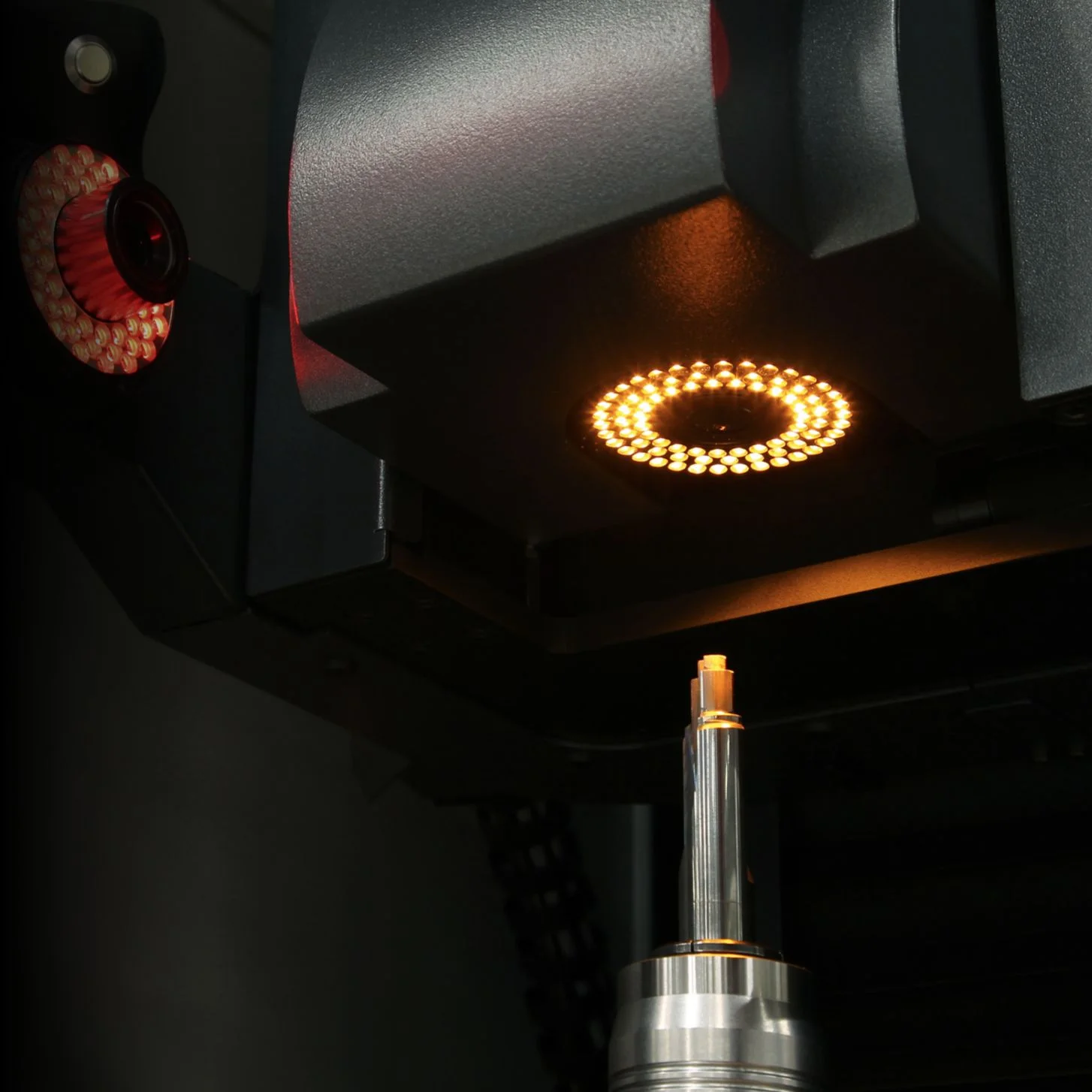 ermöglicht mit hochwertiger, verzeichnungsarmer Optik und telezentrischem Durchlicht das μm-genaue Vermessen von Schneidenkonturen sowie der Stufengeometrie im Schattenriss mit bis zu 5 Mpx. Die Kamera verfügt über eine hohe Bildwiederholrate für schnellen Fokus und Konturaufnahme aus der Werkzeugrotation. Das Multi-LED-Ringlicht sorgt für eine lichtstarke und kontrastreiche Ausleuchtung der Schneideninspektion im Auflicht.