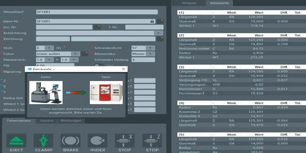Schnittstellen – das Prüf- und Messgerät empfängt eine Messdatendatei vom Programmiersystem oder der Schleifmaschine und generiert automatisch den Messablauf. Die gemessenen Werkzeug-Ist-Daten werden vom ZOLLER-Prüf- und Messgerät zum Programmiersystem oder an die Maschinensteuerung übertragen, wo das NC-Programm für die Serienfertigung optimiert wird.