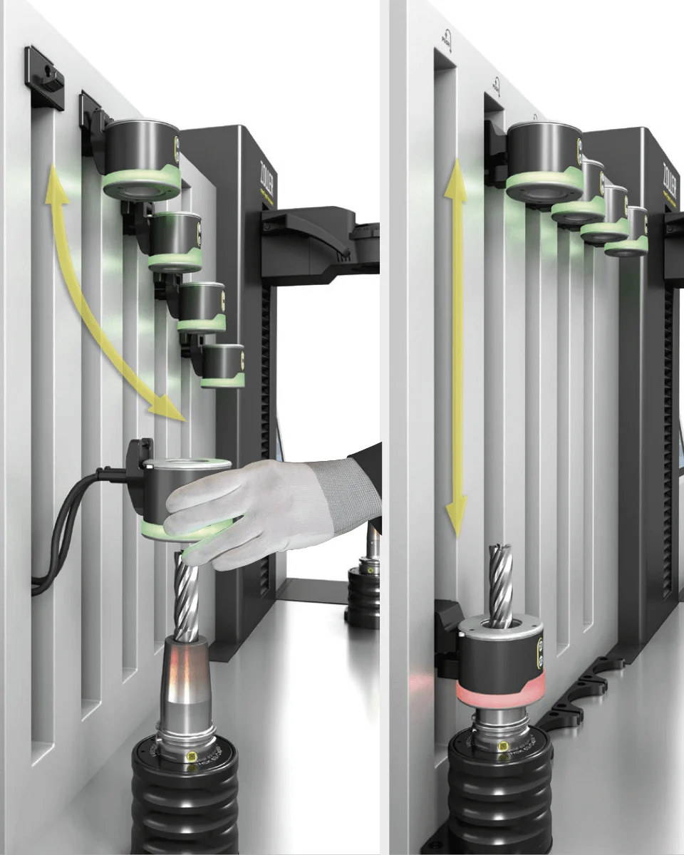 Innovative Kühlglocken mit »coolbyLight« Bedienerführung und Kühlmanagement sowie Durchmesseranzeige – führen die Bedienerin und den Bediener mithilfe des Farbsystems und den LEDs an den Kühlglocken sicher durch den Kühlprozess. Zusätzlich sind die Kühlglocken mit den entsprechenden Werkzeugdurchmessern hochwertig gekennzeichnet.