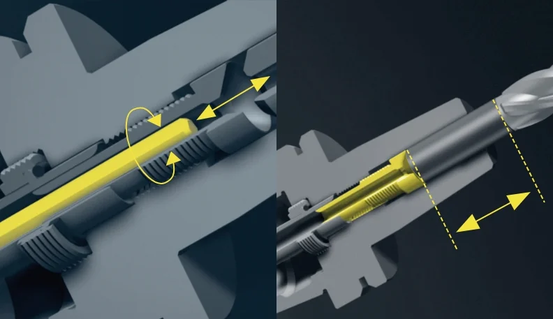 CNC-gesteuerte lineare Nachstelleinrichtung zum Einstellen von Werkzeugen auf Länge über Anschlagstange. Alternativ als »asza-rot« erhältlich, mit welcher die Werkzeuglänge wahlweise über die automatische Rotation der Längeneinstellschraube eingestellt werden kann (gilt nicht für Schrumpffutter).