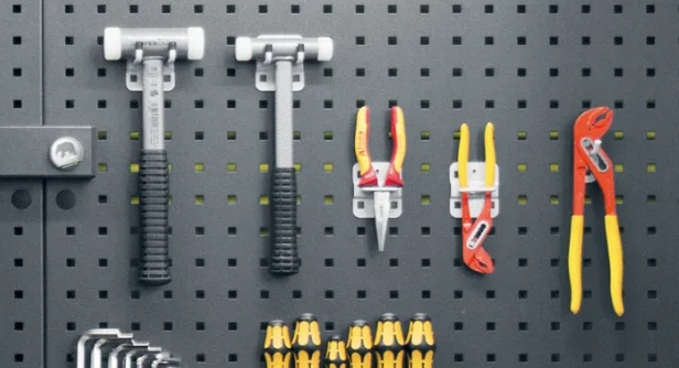 Rückwand – mit Raster zur Anbringung von Handwerkzeugen und Behältern.