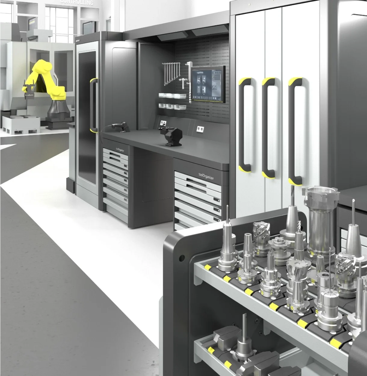 Wertschöpfung beginnt mit Organisation. Smart Cabinets bereiten Ihr Lager bestens vor auf die nächsten Aufträge. Werkzeuge, Werkzeugaufnahmen, Kleinteile, Komplettwerkzeuge, Hilfsmittel und Prüfmittel liegen griffbereit. Die Montagestationen und Werkzeugwagen machen Prozesse wie Vorbereitung und Transport einfach und ergonomisch.