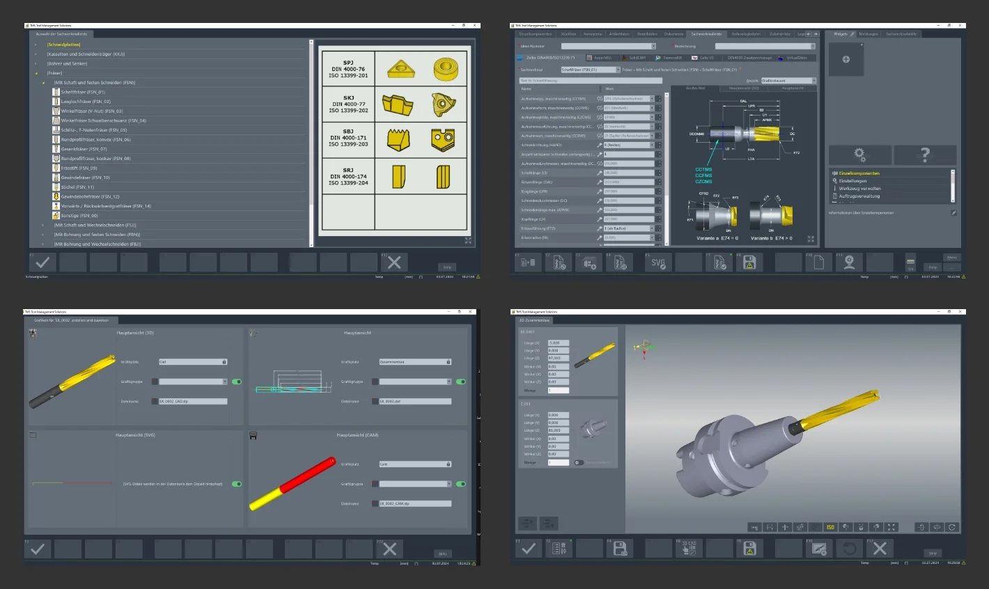 Arbeiten Fertigungsbetriebe mit individuellen Werkzeugen, lassen sich diese in der Software TMS Tool Management Solutions über Eingabe-felder mit einer Vielzahl an Parametern und Kriterien definieren und speichern. „Zunächst wählt das Personal ein Bearbeitungsverfahren für das anzulegende Werkzeug, zum Beispiel Fräsen. Dann erhält es ein Stammdatenblatt für Fräswerkzeuge auf dem Bildschirm. Dort sind die für diese Werkzeugkategorie festzulegenden Geometrien und Parameter enthalten,“ berichtet Robin Bender.