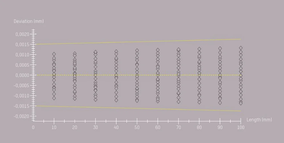 The demands in quality management are constantly increasing. That is why you must be able to rely on the constant measuring deviations of your machines. In ZOLLER measuring machines, high-precision calibration standards made of Borofloatglas® are used to determine the length measurement deviations in accordance with the DIN EN ISO 10360 standard. In accordance with this standard, at least three measuring sequences (25,326 relationships) are carried out. With this procedure, the accuracy of the ZOLLER measuring machines is documented in two dimensions and can be traced at any time.