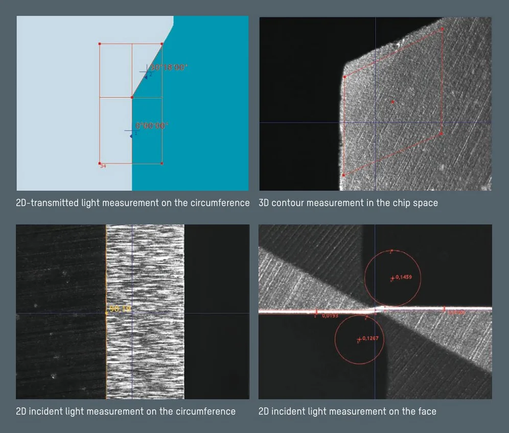 for the inspection and automatic measurement of tool geometries on the circumference, in the chip space and on the face. Simply enter the target parameters in the measuring program dialog and every measured variable is automatically measured and logged: rake angle, clearance angle, groove contour, chamfer width and many other geometries. The high-performance LEDs, segmented into eight areas, are automatically controlled by the measuring system and ensure optimum illumination of the surface thanks to automatic intensity control - for high precision and repeat accuracy.